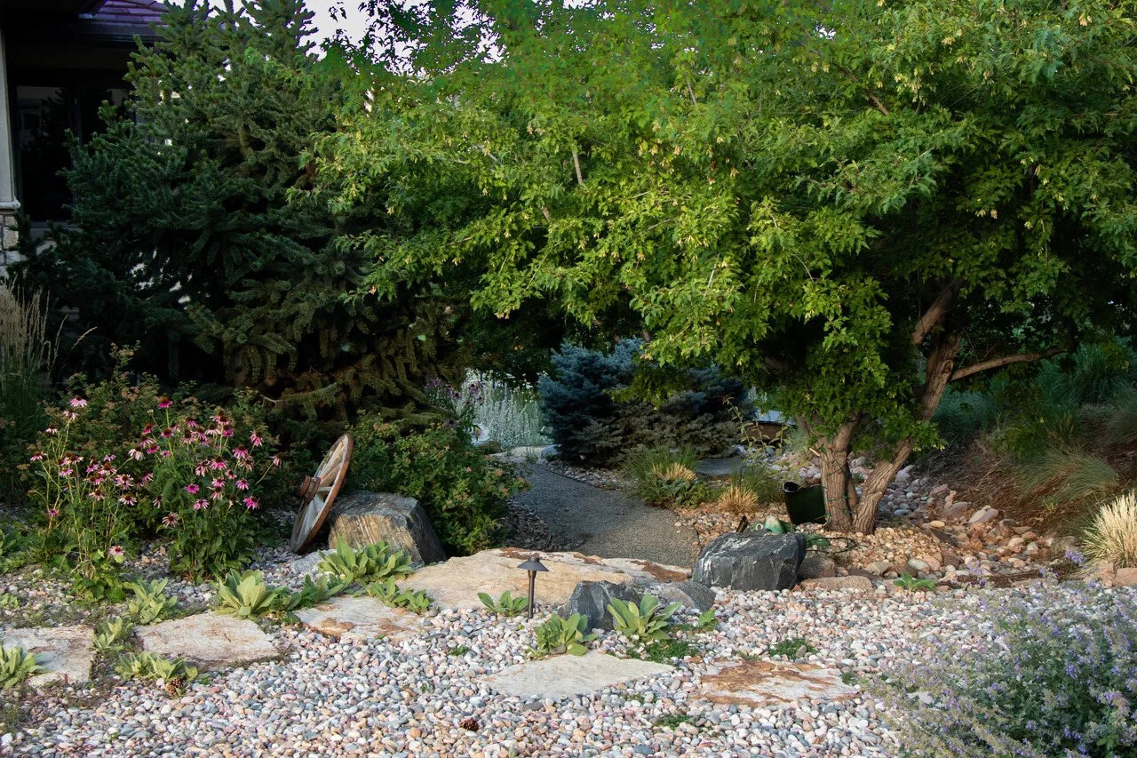 Native and adaptive species, like blue grama, penstemon, and serviceberry, all thrive here. Locally sourced stone and permeable pavers are ideal for hardscapes.